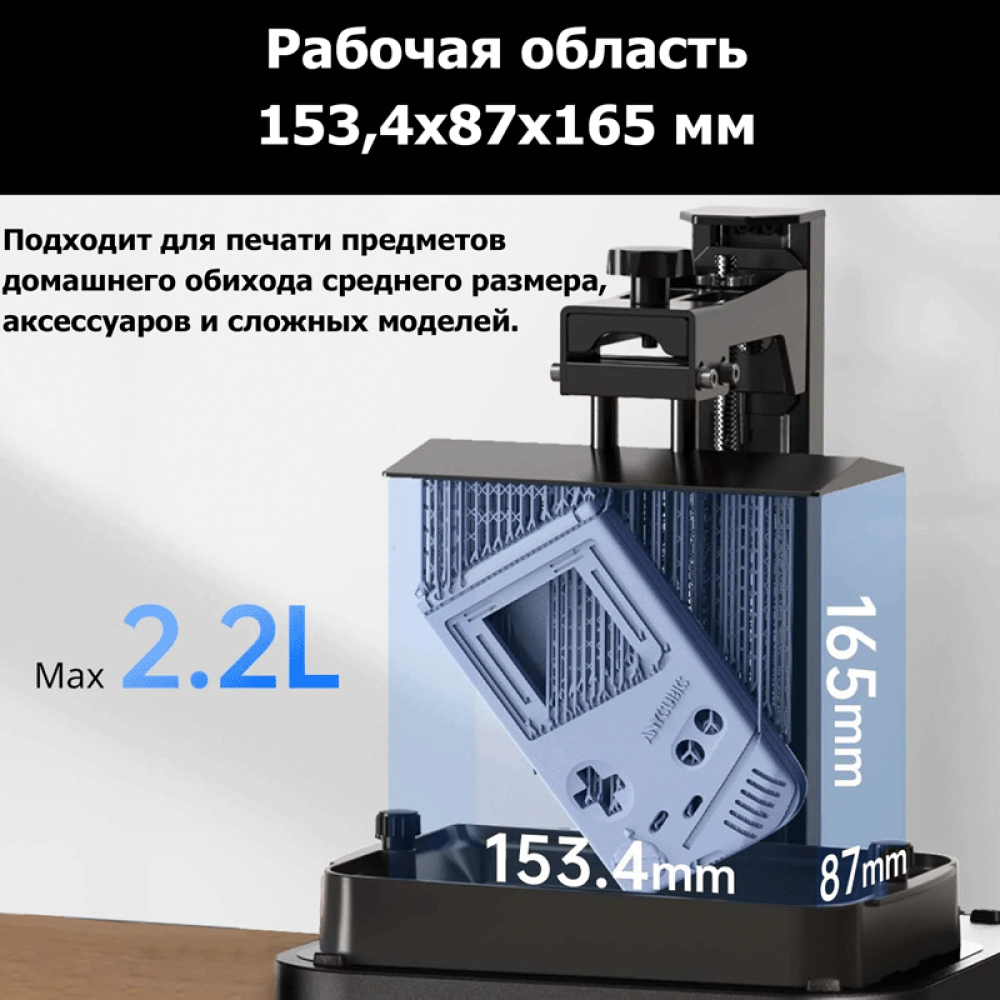Баспа көлемі 2,2 л (153×87×165 мм) – аксессуарлар, мүсіншелер, бөлшектер мен тұрмыстық заттар үшін жеткілікті.
