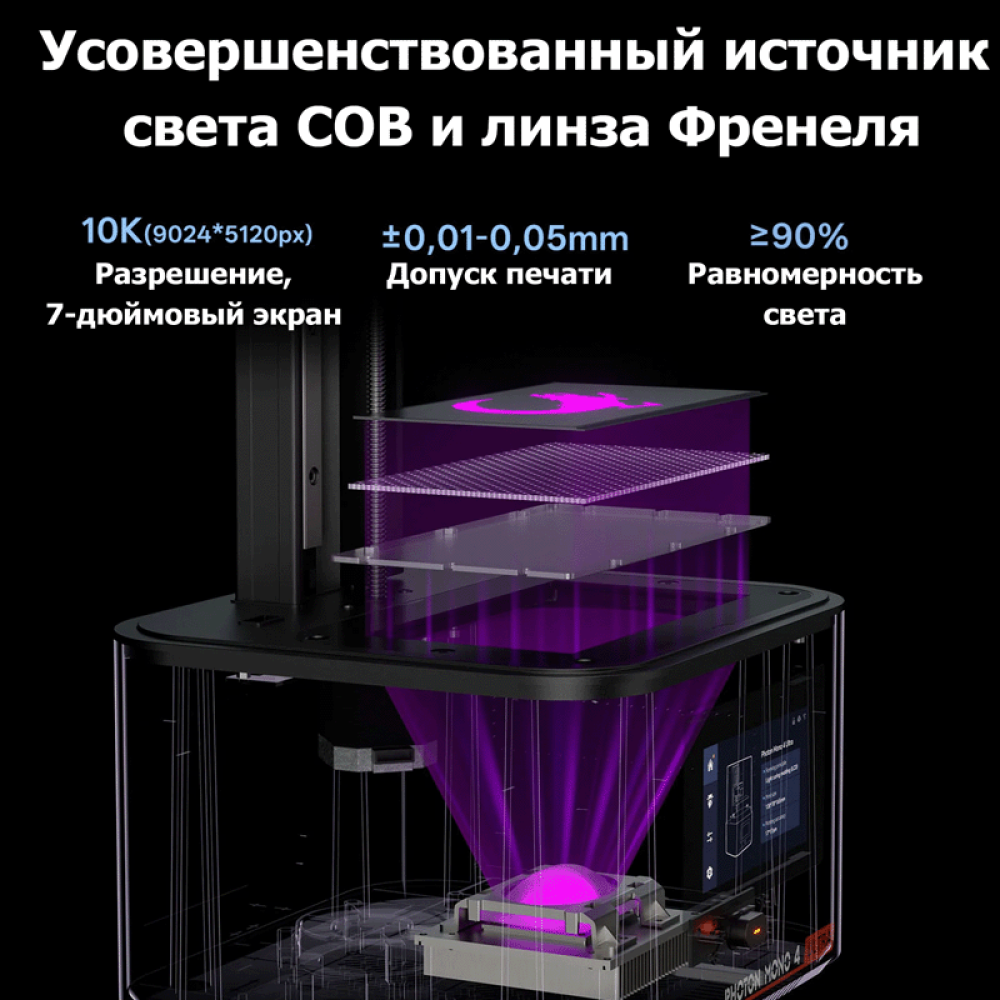 Ажыратымдылығы 9024 x 5120 пиксель және пиксель өлшемі небәрі 17 x 17 мкм болатын 7 дюймдік монохромды СКД дисплей арқылы сіз ең жақсы бөлшектер мен бетті тамаша көрсетуге қол жеткізесіз. Тіпті ең күрделі модельдер қытырлақ және шынайы көрінеді.