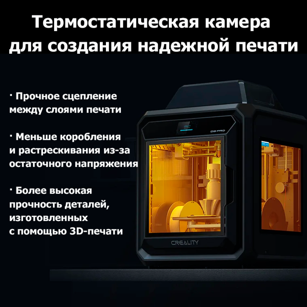 - Термокамера с температурой нагрева 60 °C: поддерживает стабильную температуру для печати, что минимизирует деформацию и улучшает адгезию между слоями, повышая прочность деталей.
