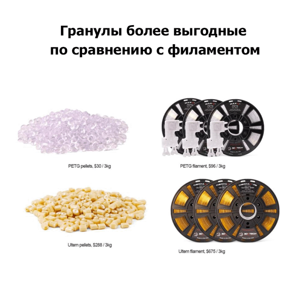 Материал для печати | Пластиковые гранулы, PLA, ABS, Carbon Fiber, Wood, Nylon, PC, PETG, HIPS, PP, Flexible, TPU, PVA |