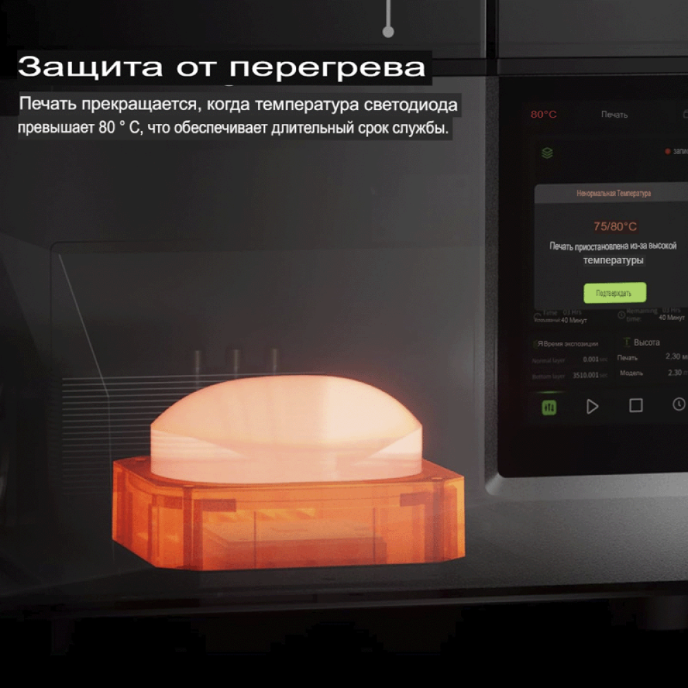 Также имеется система защиты при температуре светодиодов выше 80°C с использованием медных трубок и вентилятора. Работает 3D-принтер с экосистемой Mars и аксессуарами, такими как фильтрация воздуха Mars Mate.