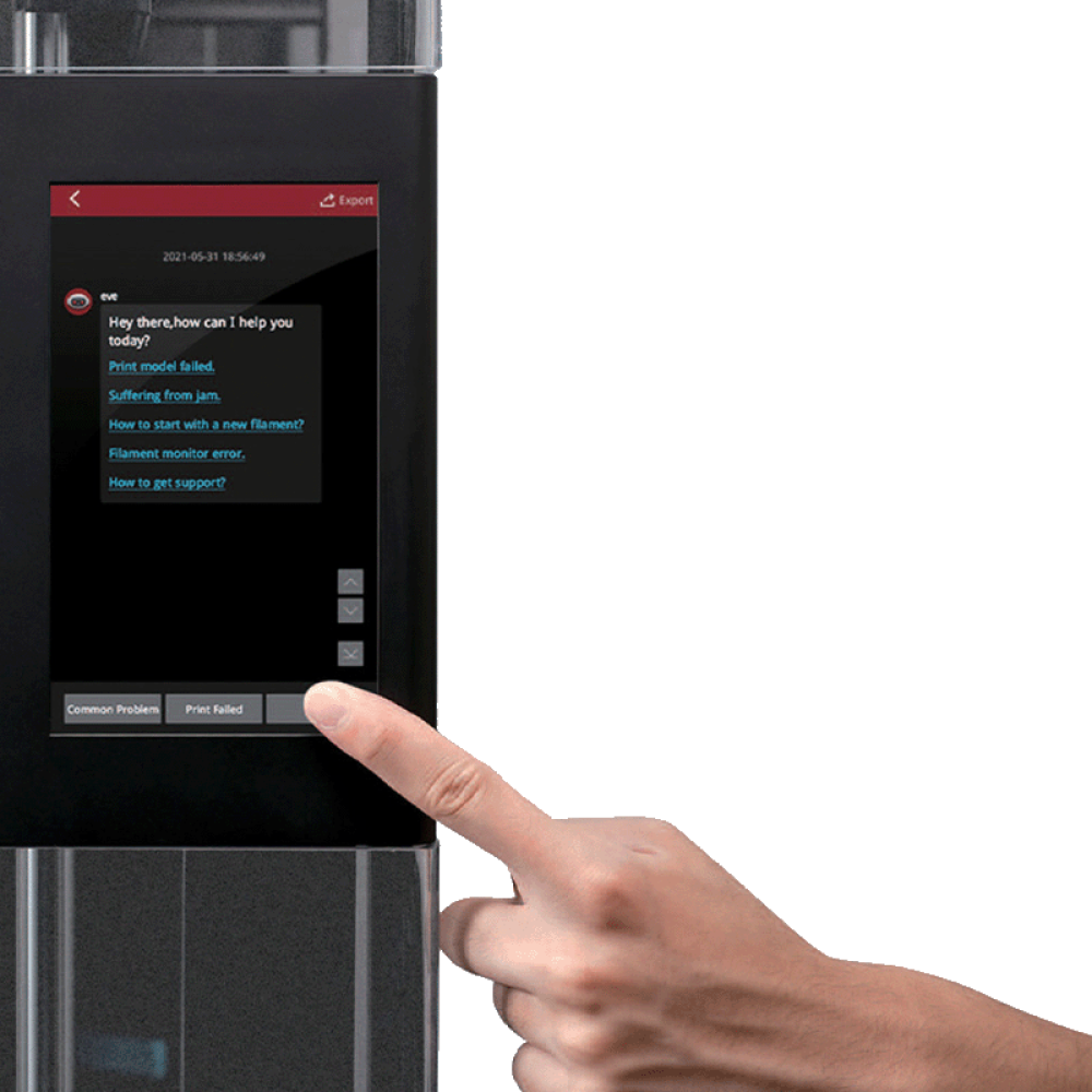 Датчик окончания филамента предупреждает пользователя о необходимости заменить материал, а система восстановления печати позволяет продолжить работу с того места, где процесс был прерван, после потери электроэнергии. Принтер оснащен датчиком открытия дверцы, который немедленно приостанавливает печать, если дверца устройства открыта, что гарантирует безопасность пользователя.