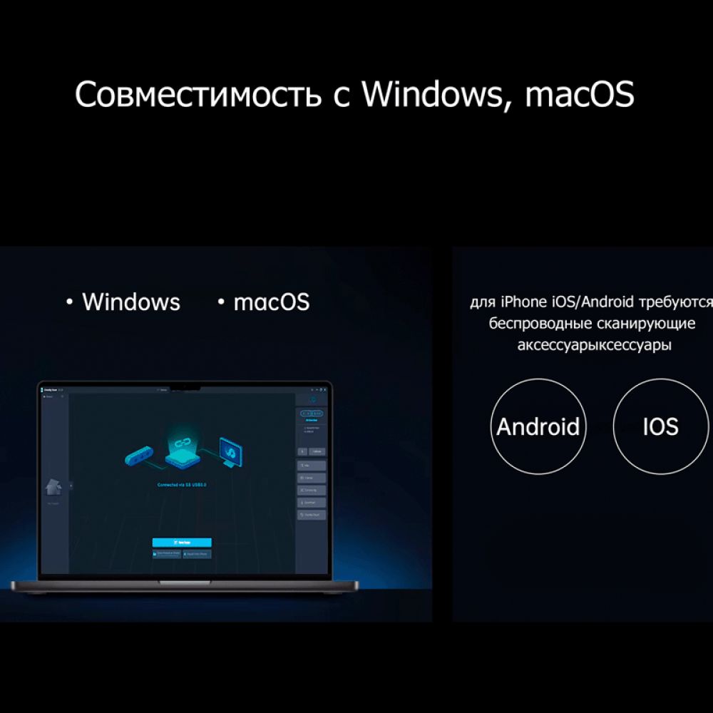 Дополнительная информация | цветная передача цвета; два типа линз; съёмка маленьких и больших объектов; защита глаз; сканирование чёрных/металлических объектов без спрея; интеграция с 3D-печатью |