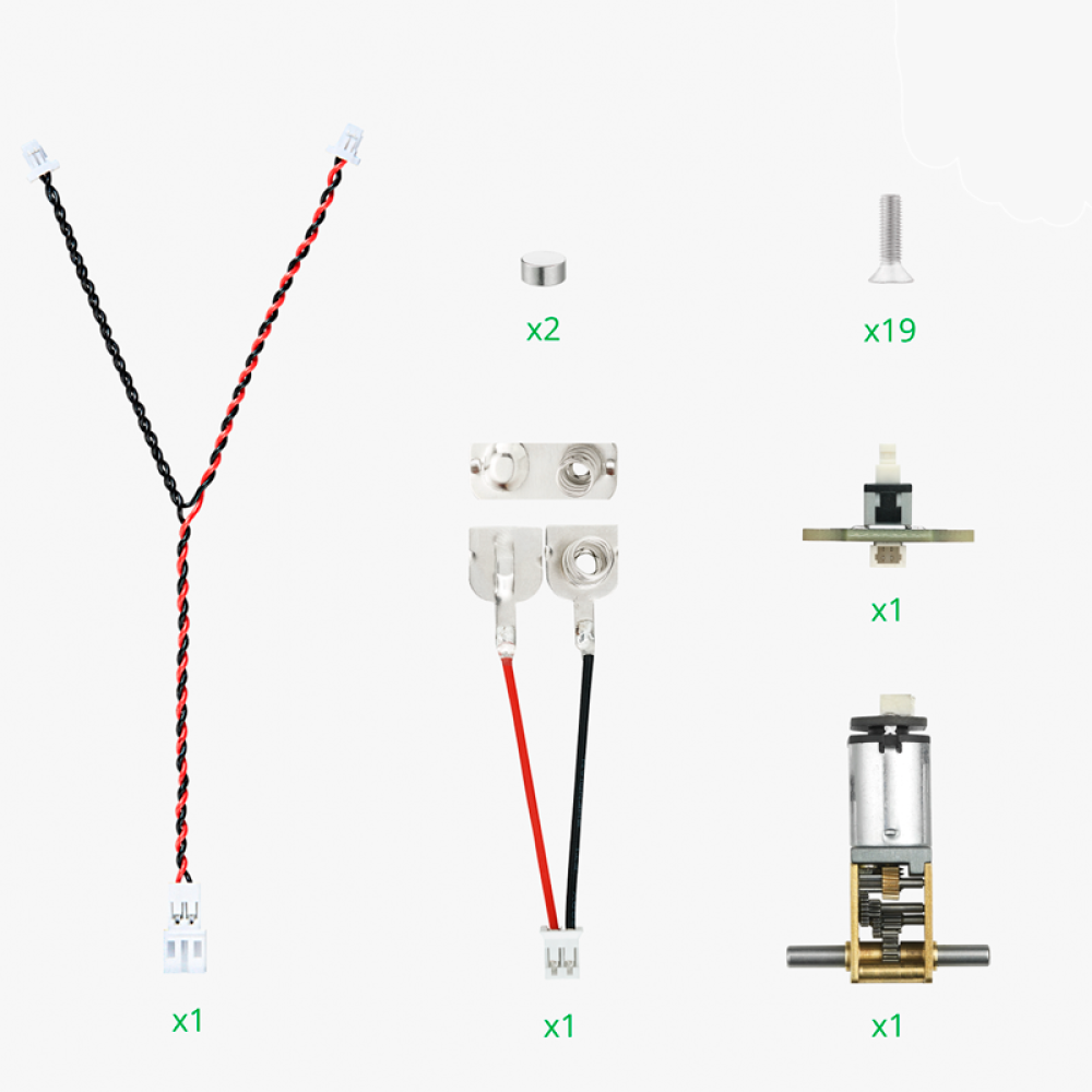 Комплектация | Мотор N20 с двойным валом (130 об/мин) — 1 шт. Пластина с пружинным контактом для батареи AAA с разъёмом PH2.0 — 1 шт. Кнопочный переключатель с разъёмом SH1.0 — 1 шт. Шурупы M2x6 FHCS (машинные) — 19 шт. Круглый магнит 4×2 мм — 2 шт. Провод Y-образный PH2.0 на два SH1.0 длиной 100 мм — 1 шт. |