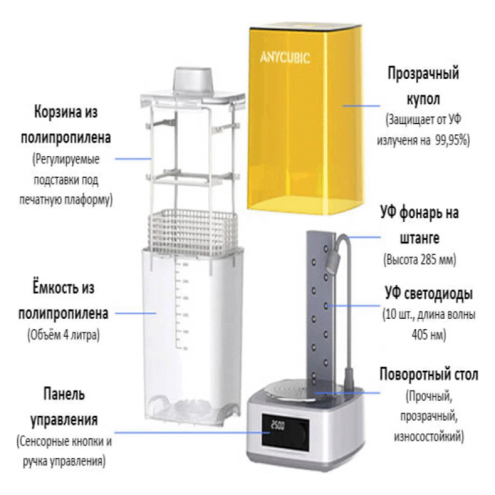 Комплектация | Корпус Anycubic Wash&Cure 3.0; Контейнер для промывки; Корзина для промывки; Лампа на "гусиной шее"; Cтойки, перекладины; Платформа; Блок питания; Набор шестигранных ключей; Руководство пользователя |
