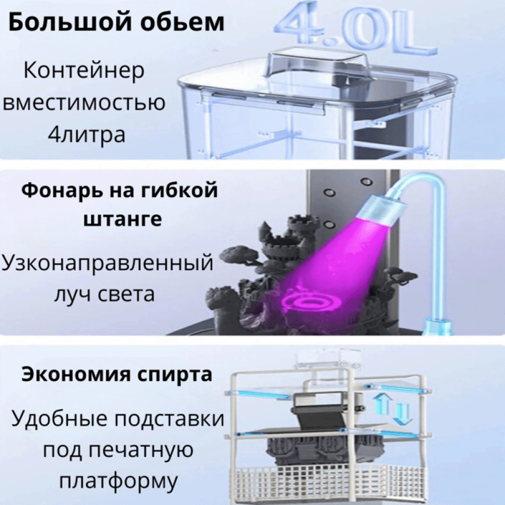 Anycubic Wash & Cure 3 — это универсальное устройство 2-в-1, созданное для удобной и эффективной постобработки моделей, напечатанных на 3D-принтерах. Оно объединяет функции промывки и UV-отверждения, экономя ваше время и пространство на рабочем столе. Объём камеры до 4 литров, большая корзина позволяют легко обрабатывать даже крупные модели, напечатанные на LCD-принтерах с экраном до 7 дюймов.