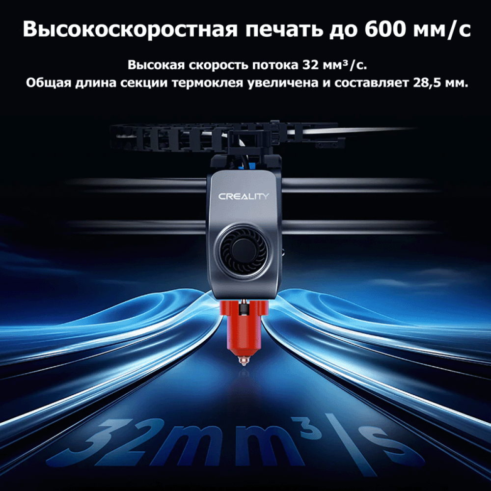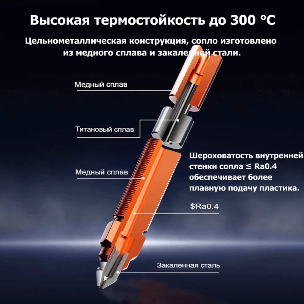 Удлинённая термозона (28,5 мм) и внутренняя шероховатость сопла ≤ Ra0.4 обеспечивают стабильную и плавную подачу пластика при скорости печати до 600 мм/с.