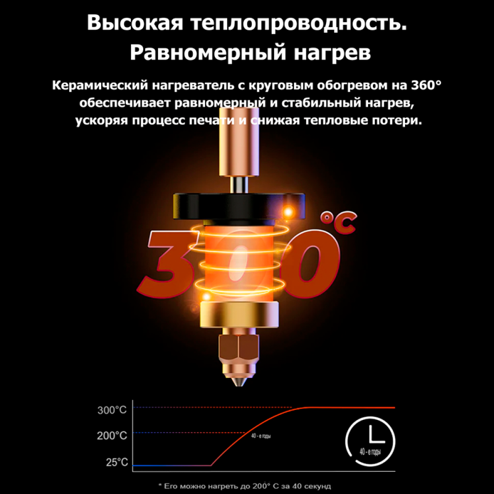 Керамический нагреватель с круговым обогревом на 360° обеспечивает равномерный и стабильный нагрев, ускоряя процесс печати и снижая тепловые потери.