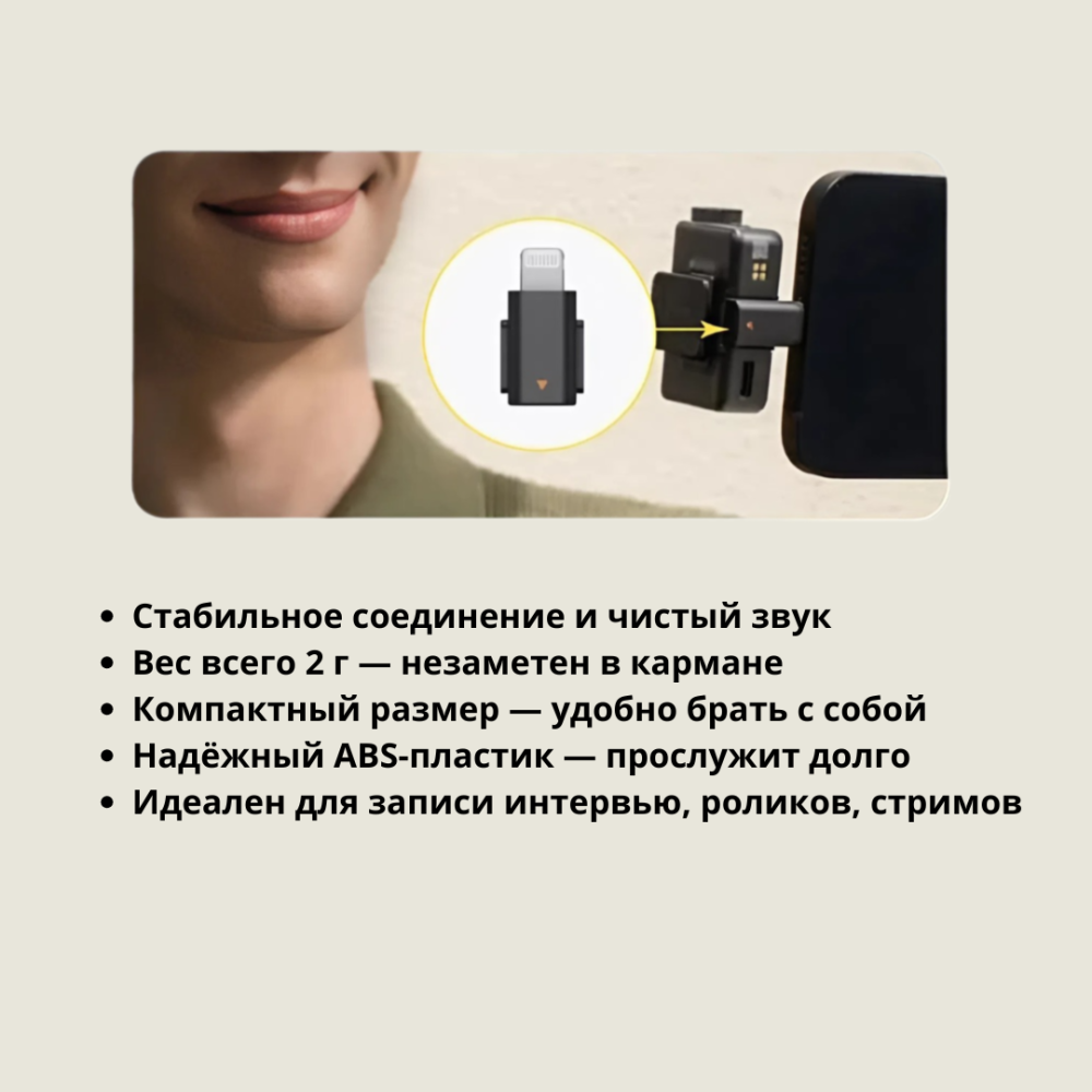 Лёгкий, надёжный и компактный — всего 2 грамма, но максимум качества. Обеспечивает стабильное соединение и чистый звук без помех. Идеален для блогеров, интервьюеров и всех, кто ценит профессиональный звук на ходу.