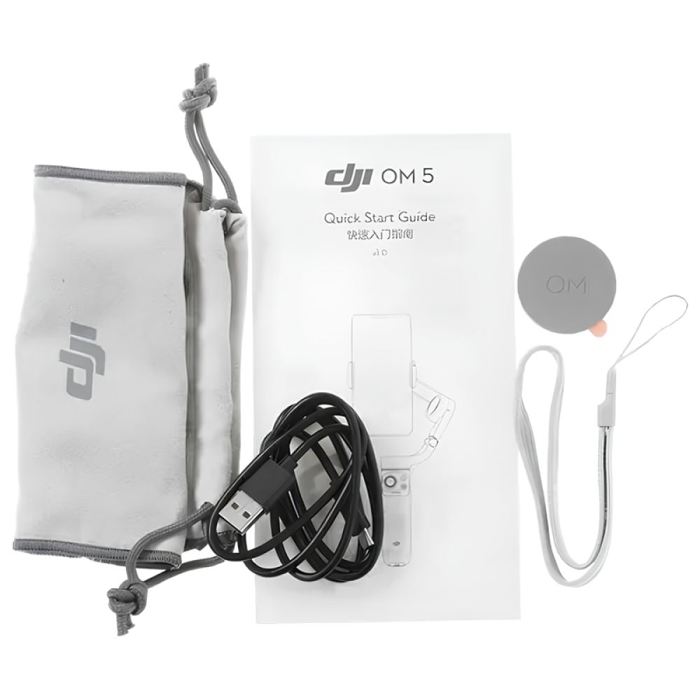 Комплектация | Стабилизатор DJI OM 5 Магнитный зажим для смартфона 2 шт Штатив Ремешок на запястье Зарядный кабель USB Type-C - Type-A Сумка для хранения Гарантийный талон |
