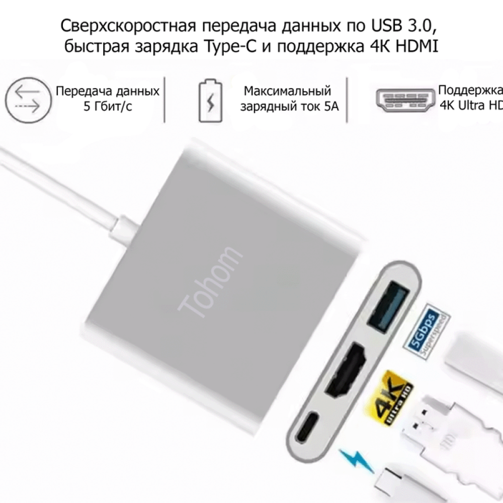 Многофункциональная док-станция Tohom 3 в 1 позволяет одновременно подключать сразу несколько устройств. Скорость передачи данных — до 5 Гбит/с, что обеспечивает быструю работу с файлами и устройствами.