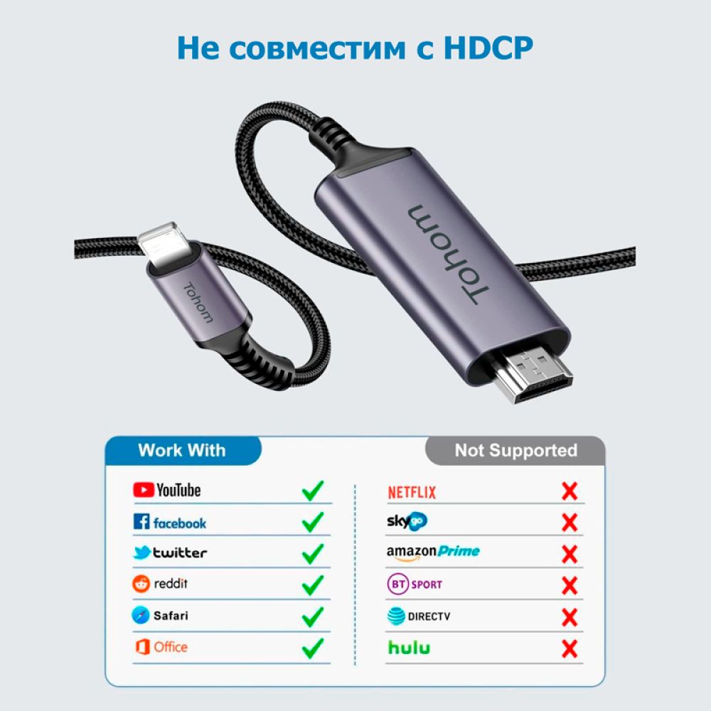 Технические характеристики Кабель Tohom HDMI - Lightning 2 м 128991568 – купить в Новосибирске