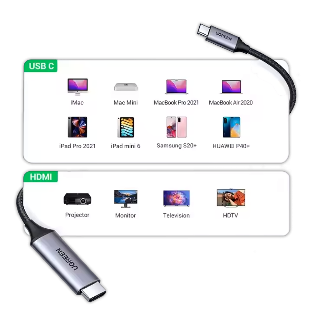 Кабель Tohom-Ugreen MM142 USB-C to HDMI подключит ваше устройство с портом USB-C к внешнему монитору или проектору с интерфейсом HDMI. Вы сможете передать, например, изображение с вашего телефона на проектор, наслаждаясь качественной картинкой без задержек, мерцания и помех.
