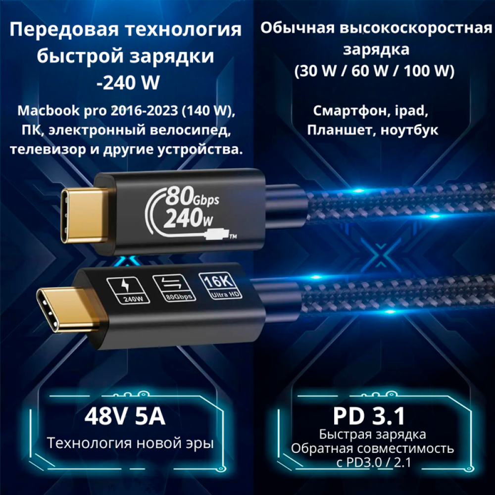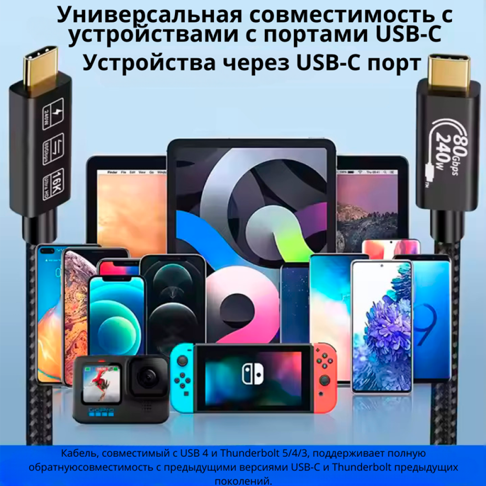 Мощность до 240 Вт позволяет не только передавать данные, но и заряжать устройства с высокой мощностью, например, ноутбуки, мониторы или даже игровые консоли. Кабель поддерживает полную обратную совместимость с предыдущими версиями USB-C и Thunderbolt предыдущих поколений. Это позволяет подключать устройства, использующие старые интерфейсы, без необходимости менять кабели или порты.