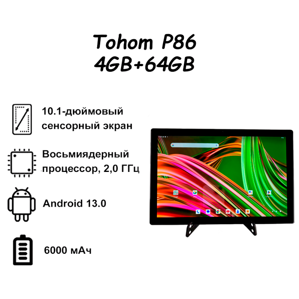 Планшет Tohom P86 — это мощное и универсальное устройство с 10,1-дюймовым емкостным сенсорным экраном и чётким FHD-разрешением 1920×1200 пикселей. Он оснащён восьмиядерным процессором MediaTek MTK6762 с тактовой частотой до 2,0 ГГц, что обеспечивает стабильную работу приложений и комфортную многозадачность.