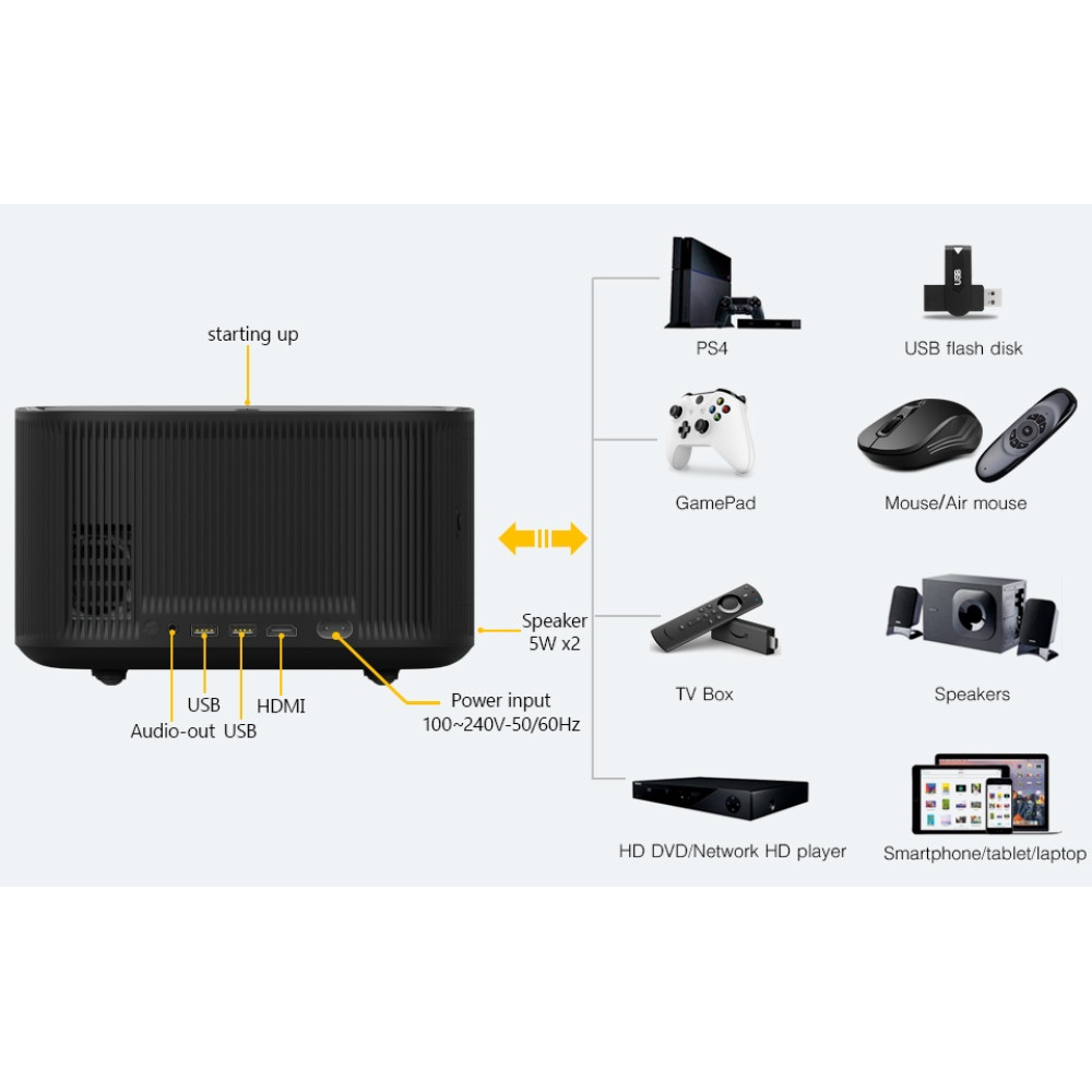 Проектор BYINTEK X30 1080P, Full HD, Wi-Fi, Bluetooth используется для просмотра мультфильмов, фильмов и других видеофайлов. Для связи со внешними устройства оборудование для презентаций использует блютуз (версия 5.0) и двухдиапазонный Wi-Fi. Также есть возможность подключения гаджетов через USB и HDMI. Портативный мини кинопроектор оснащен динамиками и разъемом для подключения наушников. Устройство в комнату можно использовать отдельно или включать в домашний кинотеатр.