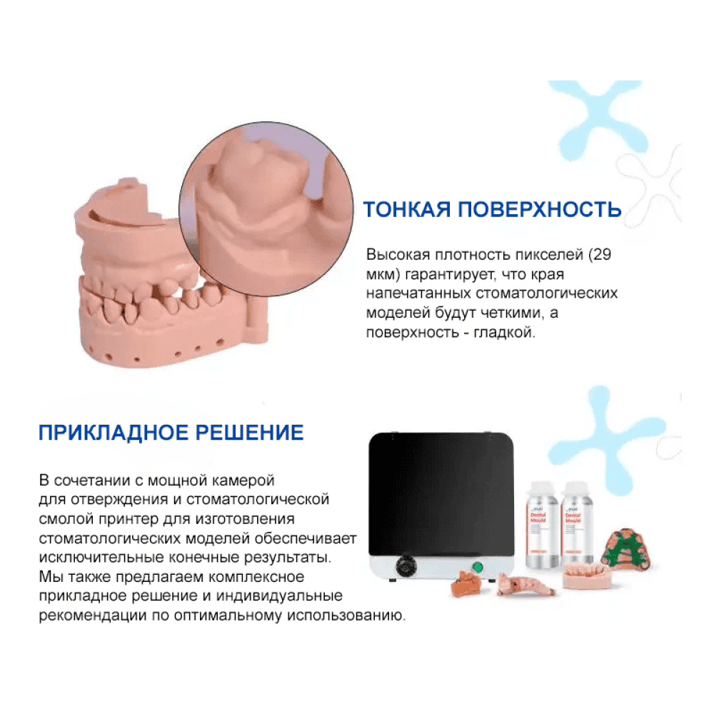 Благодаря увеличенной рабочей области принтер позволяет печатать сразу несколько моделей за один цикл, существенно ускоряя рабочие процессы и повышая эффективность лаборатории. Точная оптическая система обеспечивает чёткую передачу мелких деталей, что особенно важно при создании сложных анатомических форм.