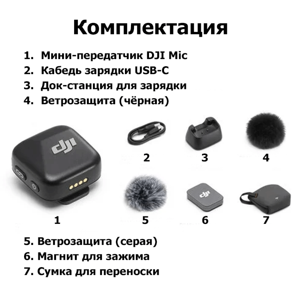 Комплектация | Микрофон DJI Mic Mini, Кабель для зарядки USB-C, Док-станция для зарядки, ветрозащита - 2 шт, магнит для мини-зажима, сумка для переноски |