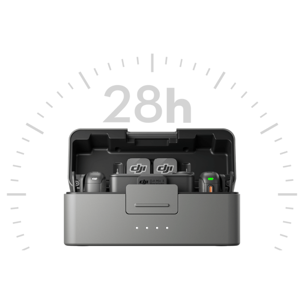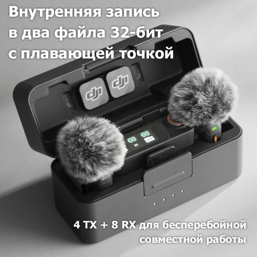 ✅ Длительная автономность: передатчики работают до 8 ч, приёмник – до 10 ч, а полностью заряженный кейс обеспечивает до 28 ч суммарного времени работы.