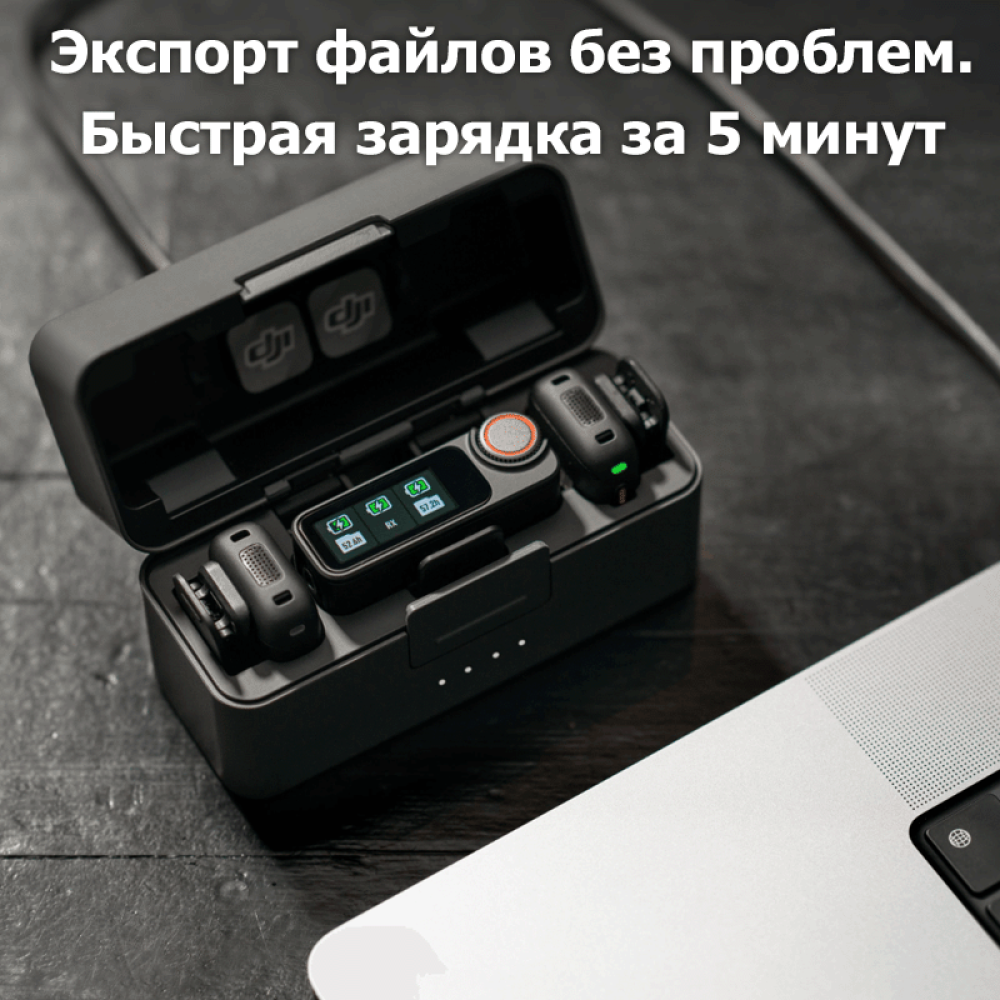 ✅ Все в одном: зарядный кейс аккуратно хранит два передатчика и приёмник, включая ветрозащитные экраны и зажимы – всё готово к использованию без лишних настроек.