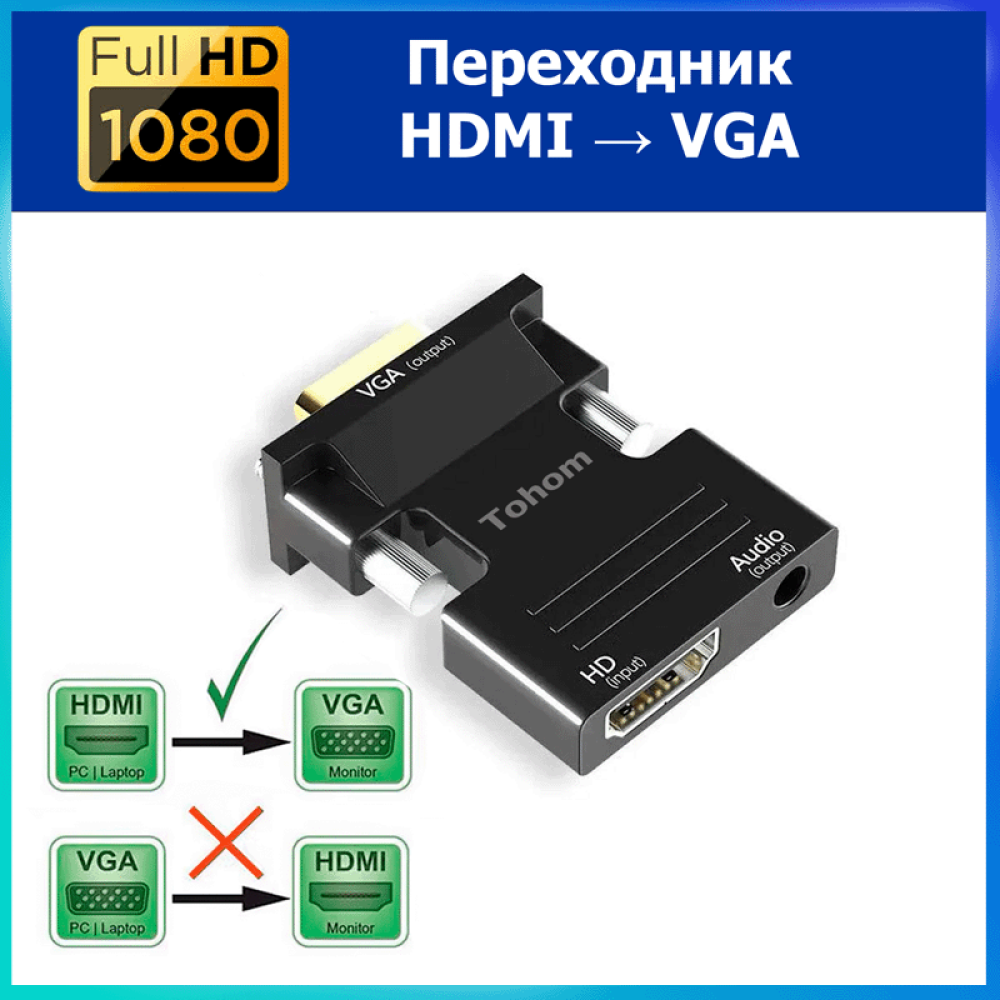 Tohom HDTV → VGA адаптер с аудио-разъемом 3.5 мм. Преобразуйте HD-видео с ноутбука, ПК или приставки в аналоговый VGA-сигнал и одновременно выводите стереозвук на колонки или комплект динамиков. Поддержка разрешения до 1920×1080 (Full HD) обеспечивает яркое, четкое и детализированное изображение на мониторе, проекторе или HDTV.