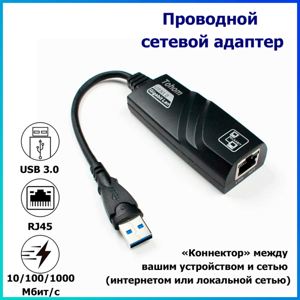 Сетевой адаптер Tohom USB 3.0 → RJ45 (10/100/1000 Мбит/с) – добавьте проводной интернет к ноутбуку или ПК одним движением. Адаптер обеспечивает стабильное подключение по Ethernet и полностью раскрывает скорость гигабитной сети через USB 3.0.